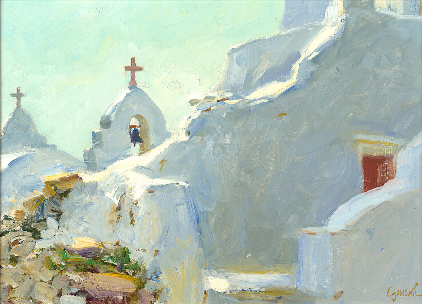 Walt Gonske, "The Paraportani Church Mykonos," oil on linen, 13 x 18 in.