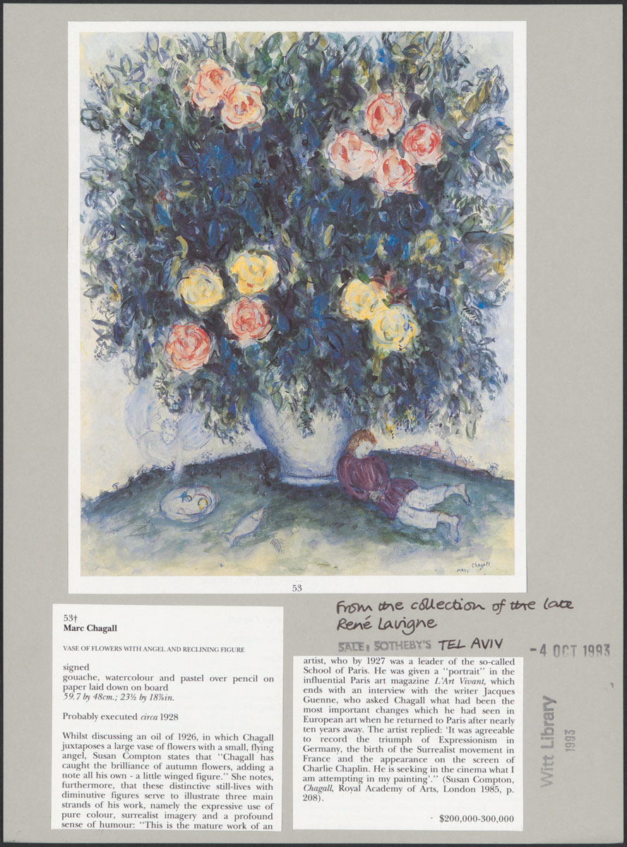 Previously stored in more than 19,000 boxes occupying almost a mile of shelf space, in 2023 the collection was shipped to the Dutch firm Picturae BV, where every item was photographed in high resolution. A useful example is illustrated above, showing Marc Chagall’s painting “Vase of Flowers with Angels and Reclining Figure” (c. 1928). Everything on this card was clipped from the catalogue of a Sotheby’s Tel Aviv auction held in 1993, the same year the card was created by a librarian, who annotated it by hand with the name of the seller. Even today, finding such obscure information online is difficult, so it’s no wonder the Witt Library features regularly as a filming location on the BBC’s hit television series Fake or Fortune.
