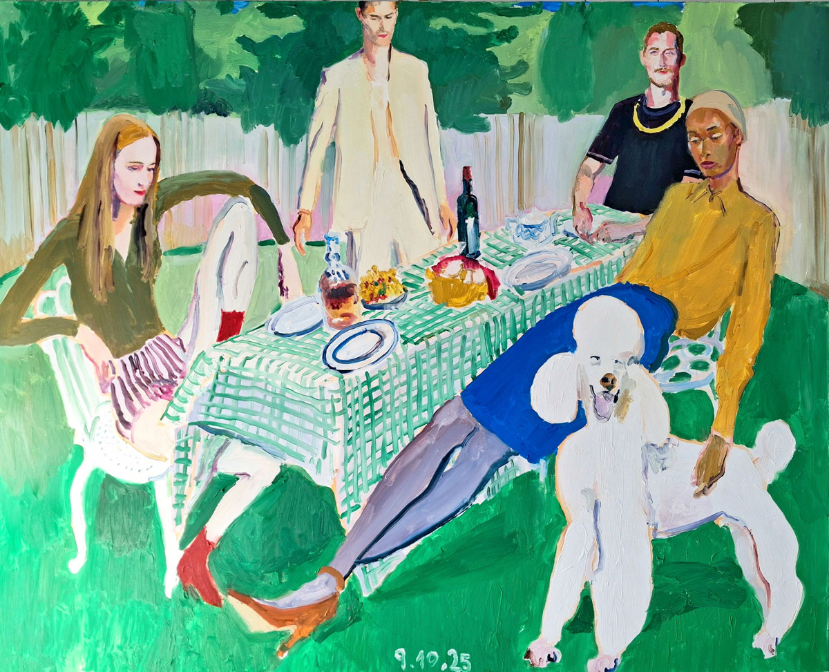 In “Dimanche 1,” four figures sit by a pool, lost in silent contemplation, time seemingly suspended. While echoes of David Hockney’s iconic pool scenes can be perceived, Solà’s incisive, contemporary, and psychologically charged approach lends this moment a unique authenticity.