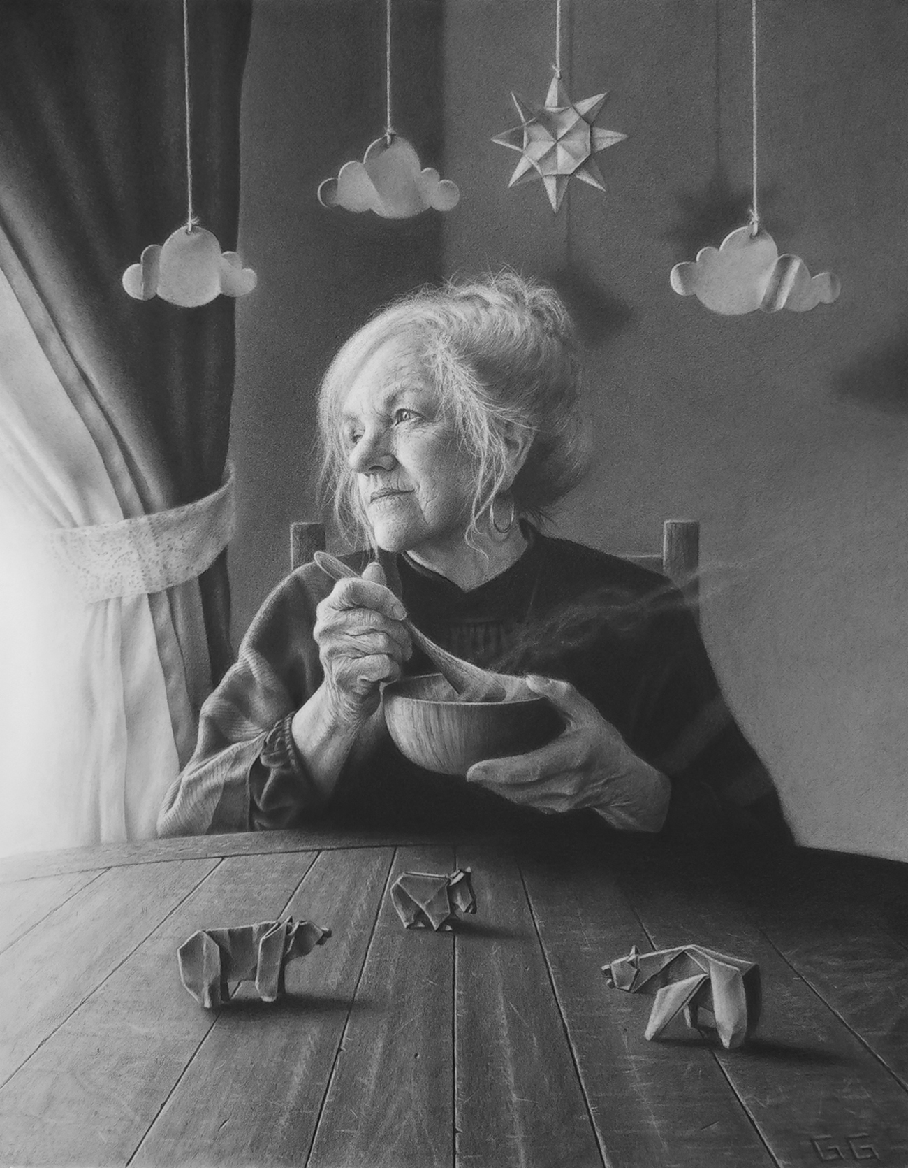 Good Morning Goldilocks, Glenn Gela, graphite and charcoal on paper, 16 x 20 in.; Glenn Gela